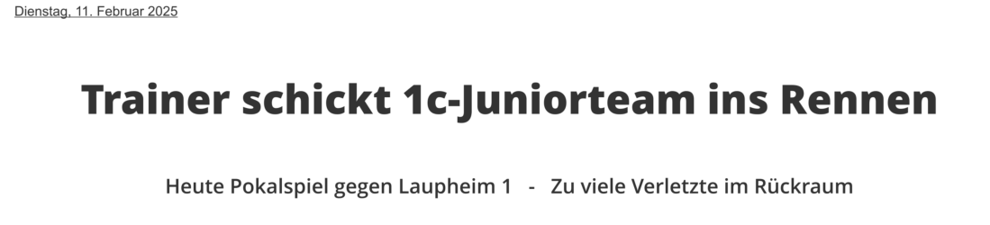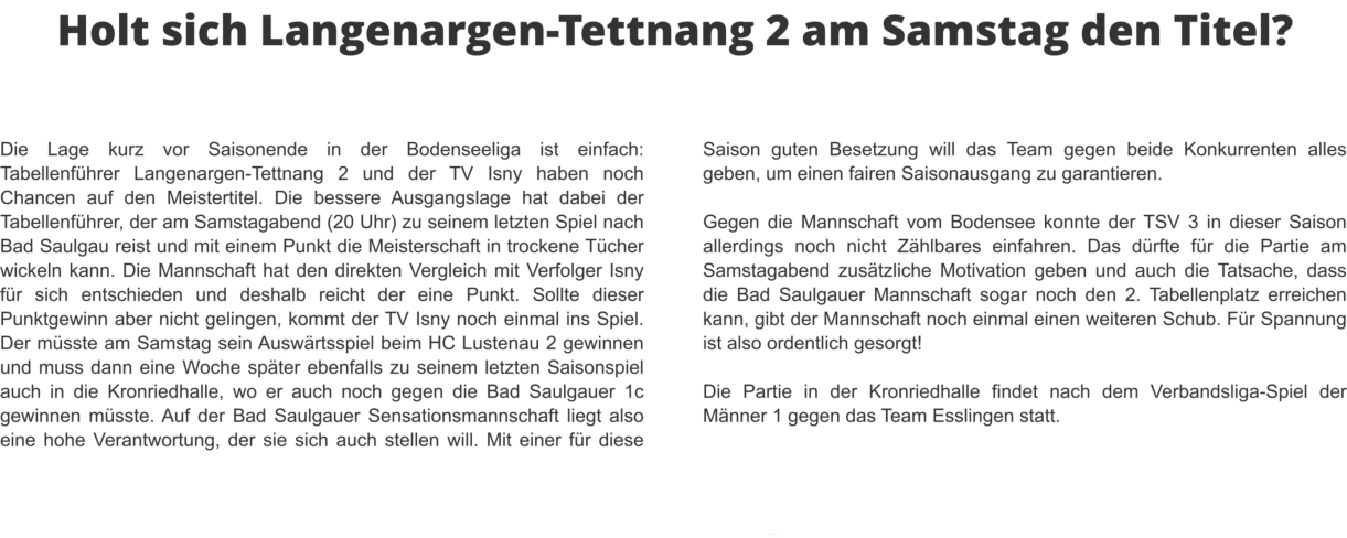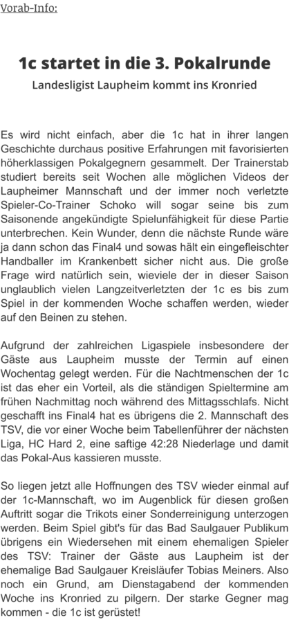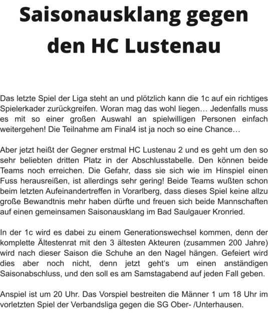 1c sinnt auf RevancheEs war das erste Spiel dieser Saison und die Gäste aus Vorarlberg zeigten im Bad Saulgauer Kronried insgesamt eine etwas bessere Leistung. Von der 37. bis zur 54. Spielminute führte der TSV 3 zwar, schaffte es aber einfach nicht, sich von den Gästen abzusetzen. In den Schlussminuten machten dann die Gastgeber den ein oder anderen Fehler zu viel und so nahmen die mannschaftlich geschlossenen Lustenauer zu Recht beide Punkte mit nach Hause. DiesesMalsollesanderslaufen,aberdieBadSaulgauer1ckommtnichtmitkompletterMannschaftausderWinterpause.ZahlreicheVerletzungenund Erkrankungen dezimieren das Team. An der Zielsetzung, sich für die Heimspielniederlage zu revanchieren, wollen jedoch alle unbedingt festhalten.