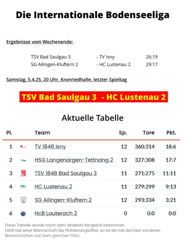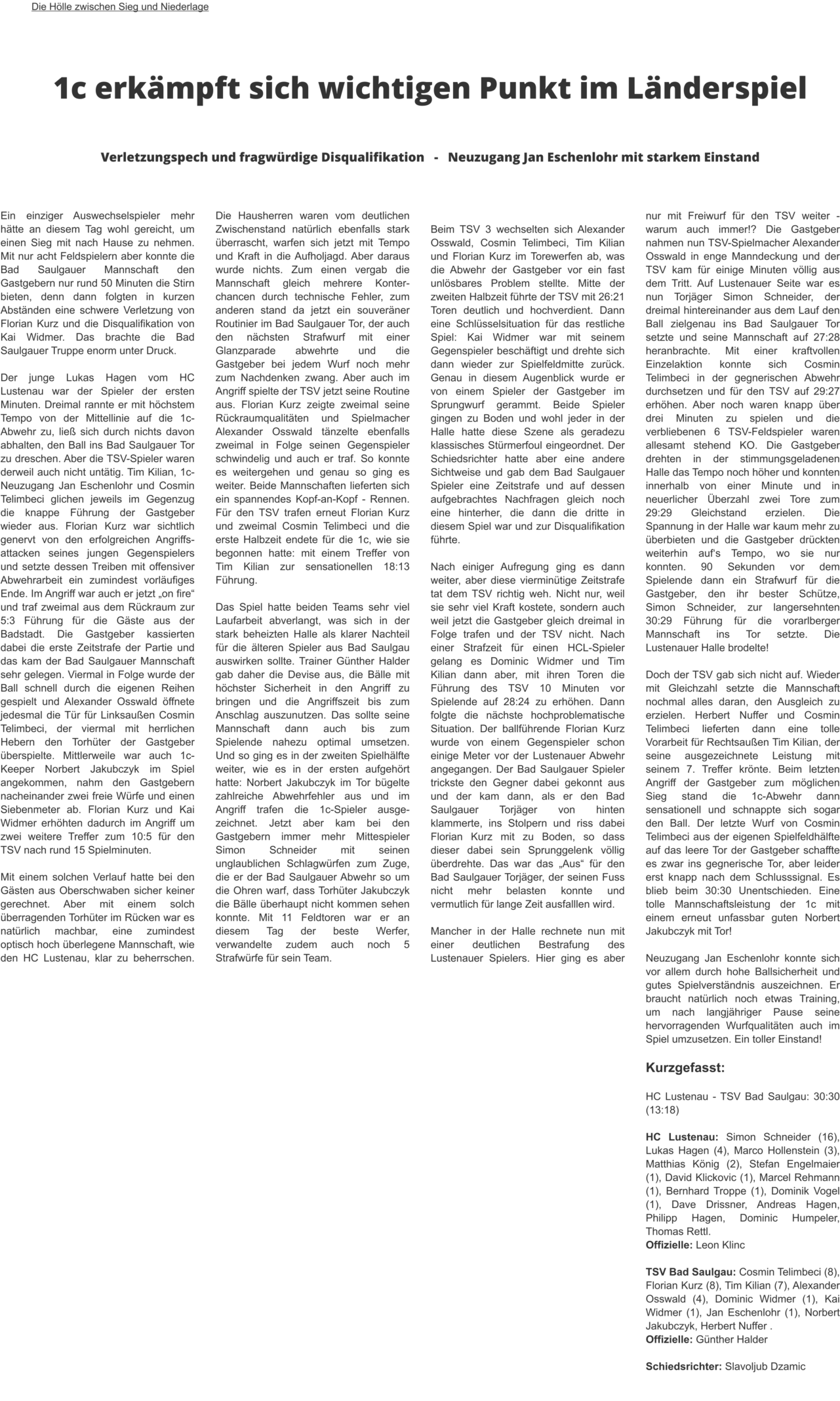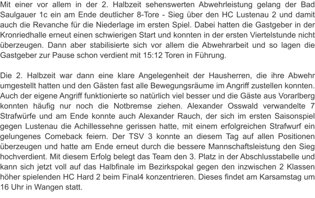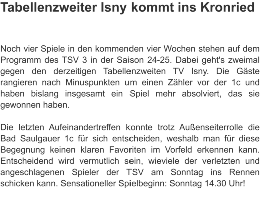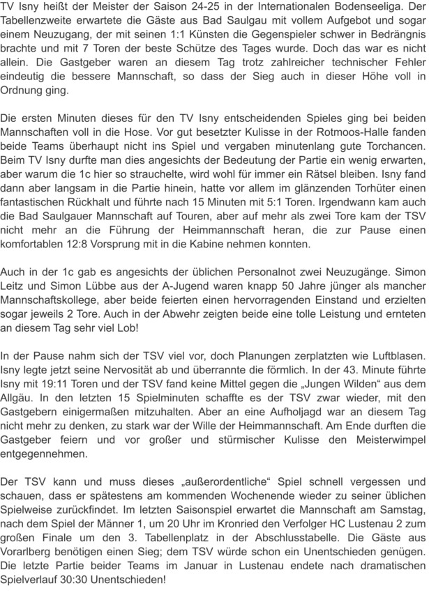 1c sinnt auf RevancheEs war das erste Spiel dieser Saison und die Gäste aus Vorarlberg zeigten im Bad Saulgauer Kronried insgesamt eine etwas bessere Leistung. Von der 37. bis zur 54. Spielminute führte der TSV 3 zwar, schaffte es aber einfach nicht, sich von den Gästen abzusetzen. In den Schlussminuten machten dann die Gastgeber den ein oder anderen Fehler zu viel und so nahmen die mannschaftlich geschlossenen Lustenauer zu Recht beide Punkte mit nach Hause. DiesesMalsollesanderslaufen,aberdieBadSaulgauer1ckommtnichtmitkompletterMannschaftausderWinterpause.ZahlreicheVerletzungenund Erkrankungen dezimieren das Team. An der Zielsetzung, sich für die Heimspielniederlage zu revanchieren, wollen jedoch alle unbedingt festhalten.