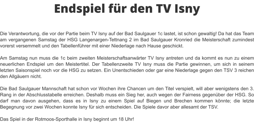 1c 13 Minuten ohne Treffer:22:29Derbe Niederlage nach Hänger in Halbzeit 2TV Isny wahrt seine Titelchancen
